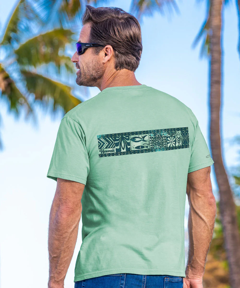 Akamu means "from the earth" in Hawaiian and you can see all the natural splendors of the islands in this multi-paneled band design. The Seaglass green coloring adds to its organic look as it conveys the laidback calm and eco-friendly lifestyle of the islands. Made from 100% cotton that is ring-spun, then combed to remove impurities, this fabric is luxuriously soft and lightweight yet incredibly strong. We only use environmentally friendly, water-based inks that penetrate the material's fiber resulting in more vibrant colors, a softer feel and artwork that doesn't crack or peel. Plus, it is proudly printed in the United States for quality you can see and designs that stand the test of time.