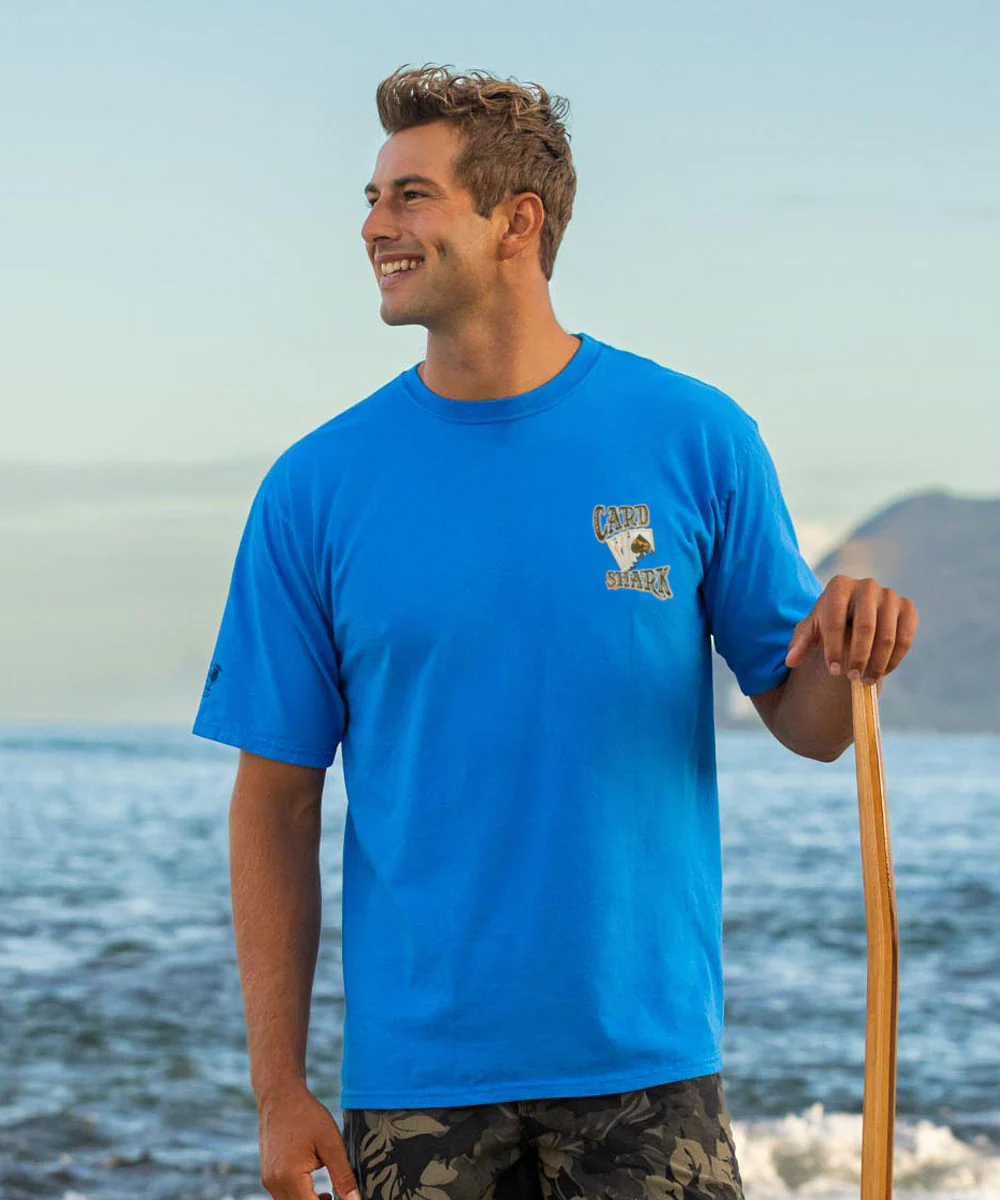 High stakes, sharp teeth, and no poker face in sight. With a wink to the wild side of Vegas, this toothy contender brings serious swagger to the table - where luck meets attitude and every hand’s a thrill. Made using our exclusive Blue Hawaii specialty dying process and featuring 100% combed ring-spun cotton, this t-shirt has 50+ SPF protection to keep you feeling cool, calm and protected all year long. We only use environmentally friendly water-based inks that penetrate the material's fiber resulting in more vibrant colors, softer feel and artwork that doesn't crack or peel. Plus, it is proudly printed in the United States for quality you can see and designs that stand the test of time.