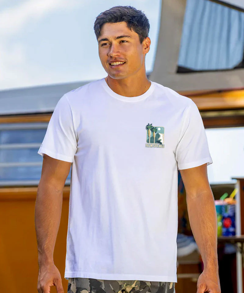 Retro desert vibes meet mid-century cool in this stylized take on Palm Springs. With bold shapes, breezy palms, and that iconic modernist flair, it’s a wearable postcard from California’s sun-soaked oasis. Already made with a luxurious fiber with brilliant luster, our Pima cotton Ts are finished with a special wash for ultimate softness and durability. We only use environmentally friendly water-based inks that penetrate the material's fiber resulting in more vibrant colors, softer feel and artwork that doesn't crack or peel. Plus, it is proudly printed in the United States for quality you can see and designs that stand the test of time.