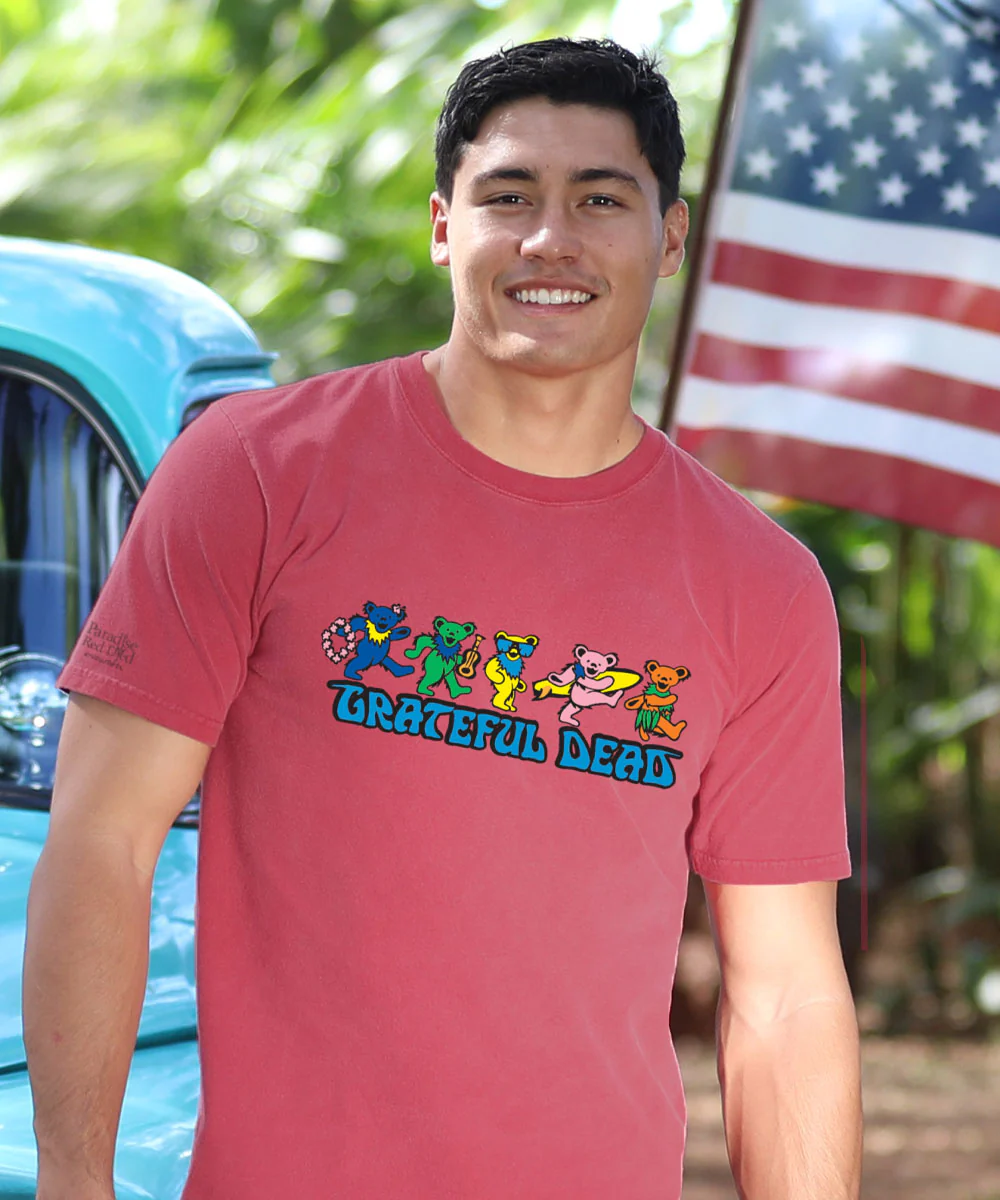Aloha! Get ready to groove with the Grateful Dead Bears, now infused with a tropical Hawaiian twist. Decked out with leis, ukuleles, sunglasses, surfboards, and grass skirts, these colorful and playful bear characters, born from the creative genius of artist Bob Thomas, exude the aloha spirit in this exclusive Crazy Shirts t-shirt design. Whether they're hula-dancing on t-shirts or simply spreading joy, these bears capture the free-spirited and joyful essence of the Grateful Dead with a touch of Hawaiian magic. Made using our exclusive Paradise Red specialty dyeing process and featuring 100% combed ring-spun cotton, this t-shirt has 50+ SPF protection to keep you feeling cool, calm and protected all year long. We only use environmentally friendly, water-based inks that penetrate the material's fiber resulting in more vibrant colors, softer feel and artwork that doesn't crack or peel. Plus, it is proudly printed in the United States for quality you can see and designs that stand the test of time.