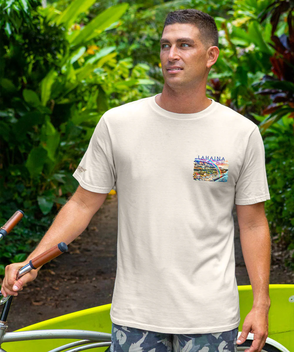 One year ago, the tragic Lahaina fires left an indelible mark on our island community. Today, we pause to remember those who were lost and to extend our deepest sympathies to those who are still healing. This anniversary is a poignant reminder of the resilience and unity that define Lahaina as her rebuilding process continues. To honor this significant milestone, we are releasing our latest tribute to Lahaina: the Lahaina Watercolor. This special design depicts the landscape as we remember it, adorned with a stunning rainbow, symbolizing hope and renewal. The Lahaina Watercolor is more than just a t-shirt; it is a heartfelt homage to the spirit of Lahaina and its people. We hope this design resonates with you as deeply as it does with US. Thank you for your continued support. Your patronage not only helps us as a business but also contributes to the strength and recovery of the community. Mahalo nui loa (thank you very much) for being a part of our 'ohana (family).