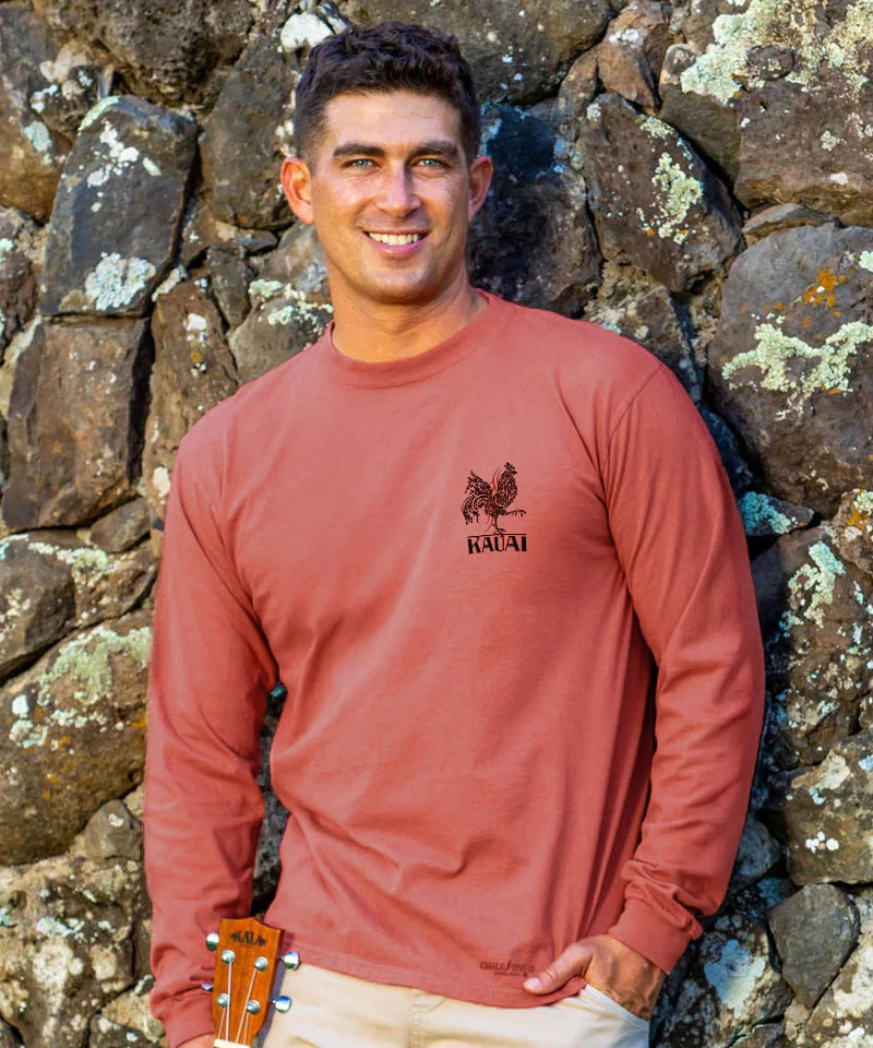 Wild, bold, and full of character - just like the island itself. This stylized chicken brings Kauai’s most notorious resident to life in fierce tribal lines, honoring the spirit of the Garden Isle with a little attitude and a whole lot of aloha. Made using our exclusive specialty dyeing process that uses real Chile peppers and featuring 100% combed ring-spun cotton, this t-shirt has 50+ SPF protection to keep you feeling cool, calm and protected all year long. We only use environmentally friendly water-based inks that penetrate the material’s fiber resulting in more vibrant colors, softer feel and artwork that doesn’t crack or peel. Plus, it is proudly printed in the United States for quality you can see and designs that stand the test of time.