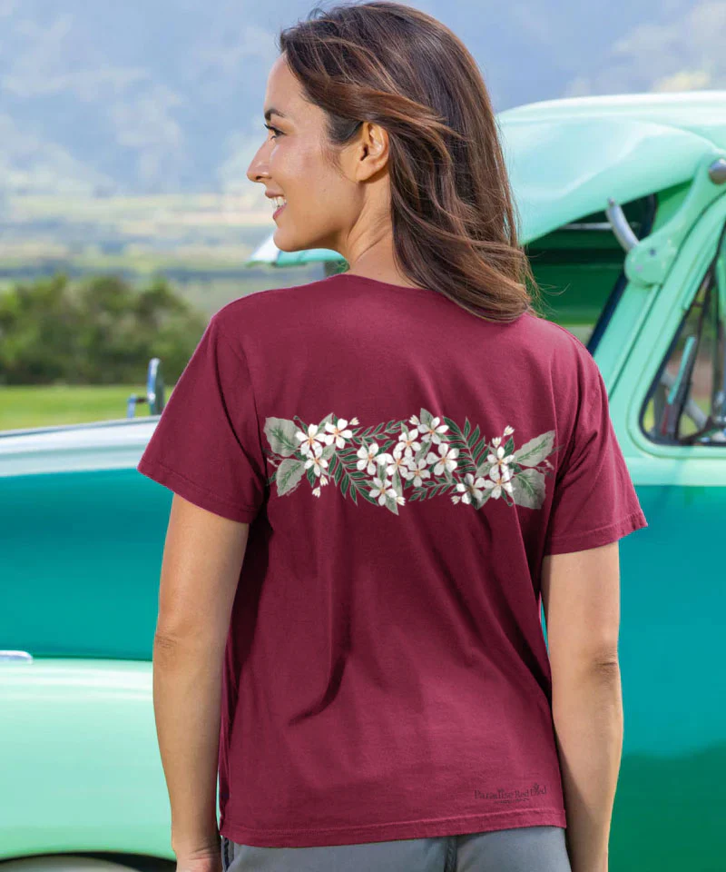 Soft as a breeze and rooted in tradition, this blooming band of island florals wraps you in aloha. With delicate petals and graceful greens, it’s a wearable lei that speaks to the beauty and spirit of Hawai‘i - timeless, elegant, and full of heart. Made from 100% cotton that is ring-spun then combed to make it luxuriously soft, this tee also features a scoop neck and relaxed cut to be both cute and comfortable. The fine, ribbed tubular, continuous collar adds to its feminine appeal and combines with the tubular knit construction and taped neck and shoulder seams for long-lasting durability. The unique color comes from our Paradise Red specialty dyeing process. We only use environmentally friendly water-based inks that penetrate the material's fiber resulting in more vibrant colors, softer feel and artwork that doesn't crack or peel. Plus, it is proudly printed in the United States for quality you can see and designs that stand the test of time.
